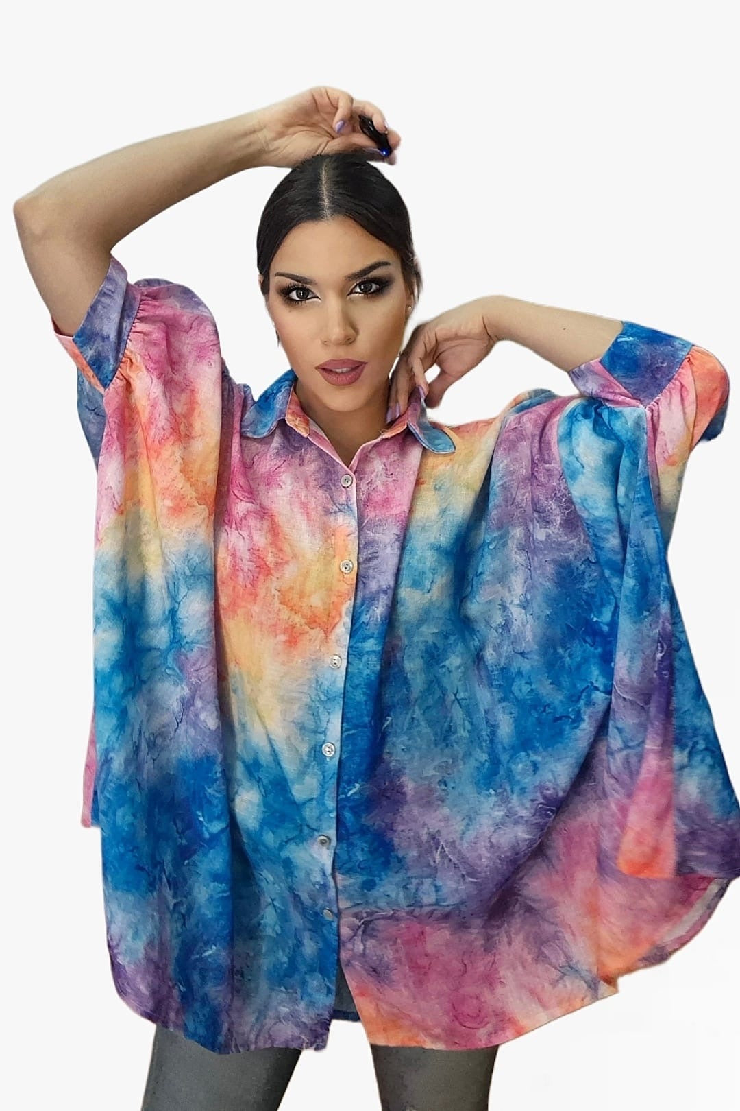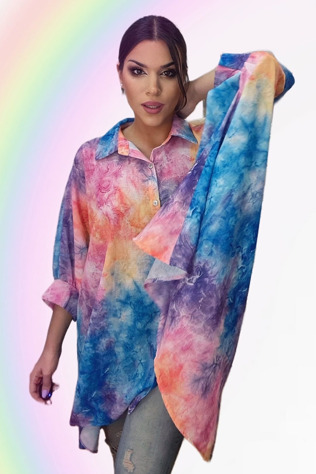 Con un estampado vibrante que mezcla tonos cálidos y fríos, este blusón efecto tie dye es una auténtica declaración de estilo. Su corte amplio y vaporoso, junto con el tejido suave y natural, lo convierten en una prenda ideal para los días de sol y planes improvisados. Dale vida a tu armario con esta pieza única y llena de energía.