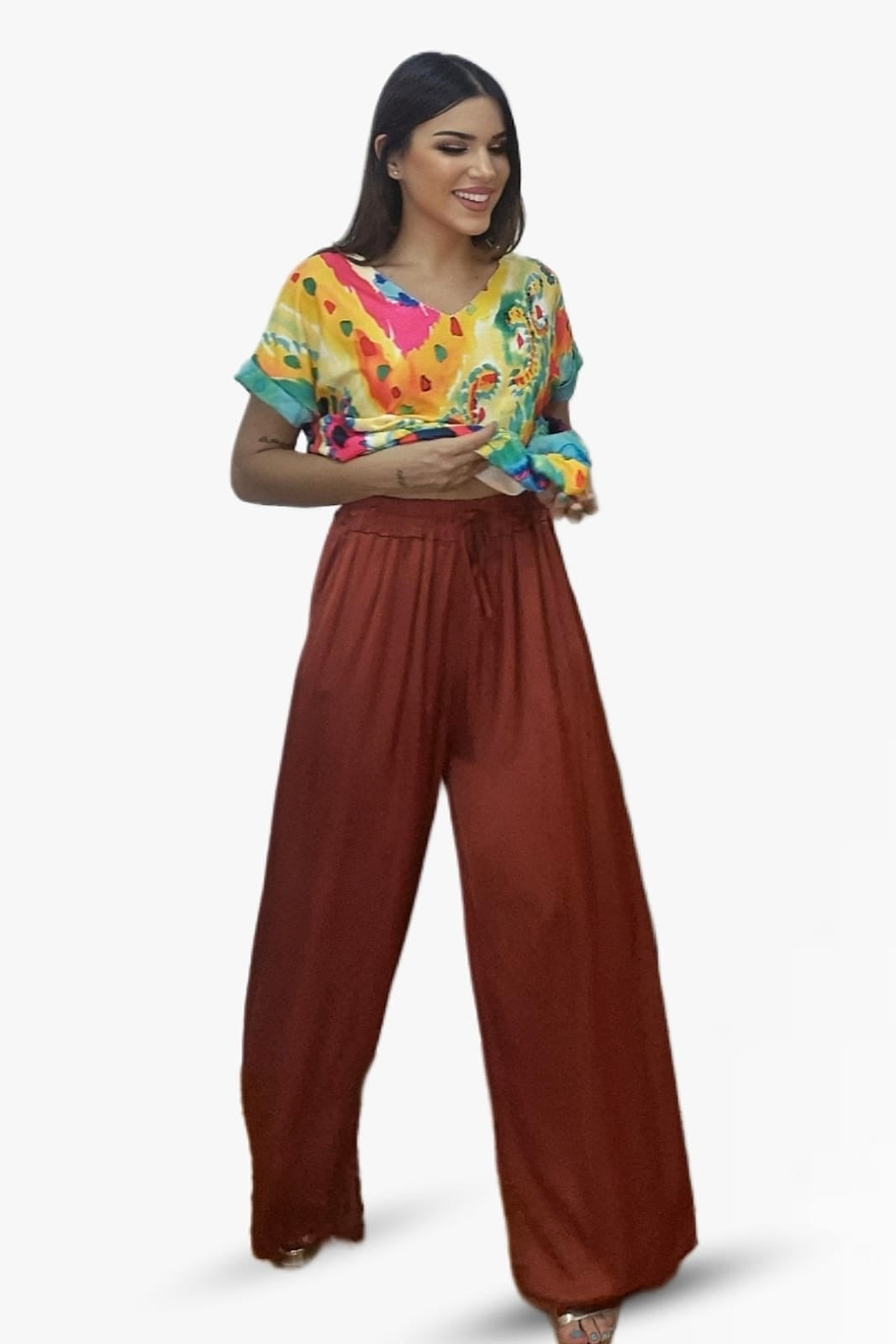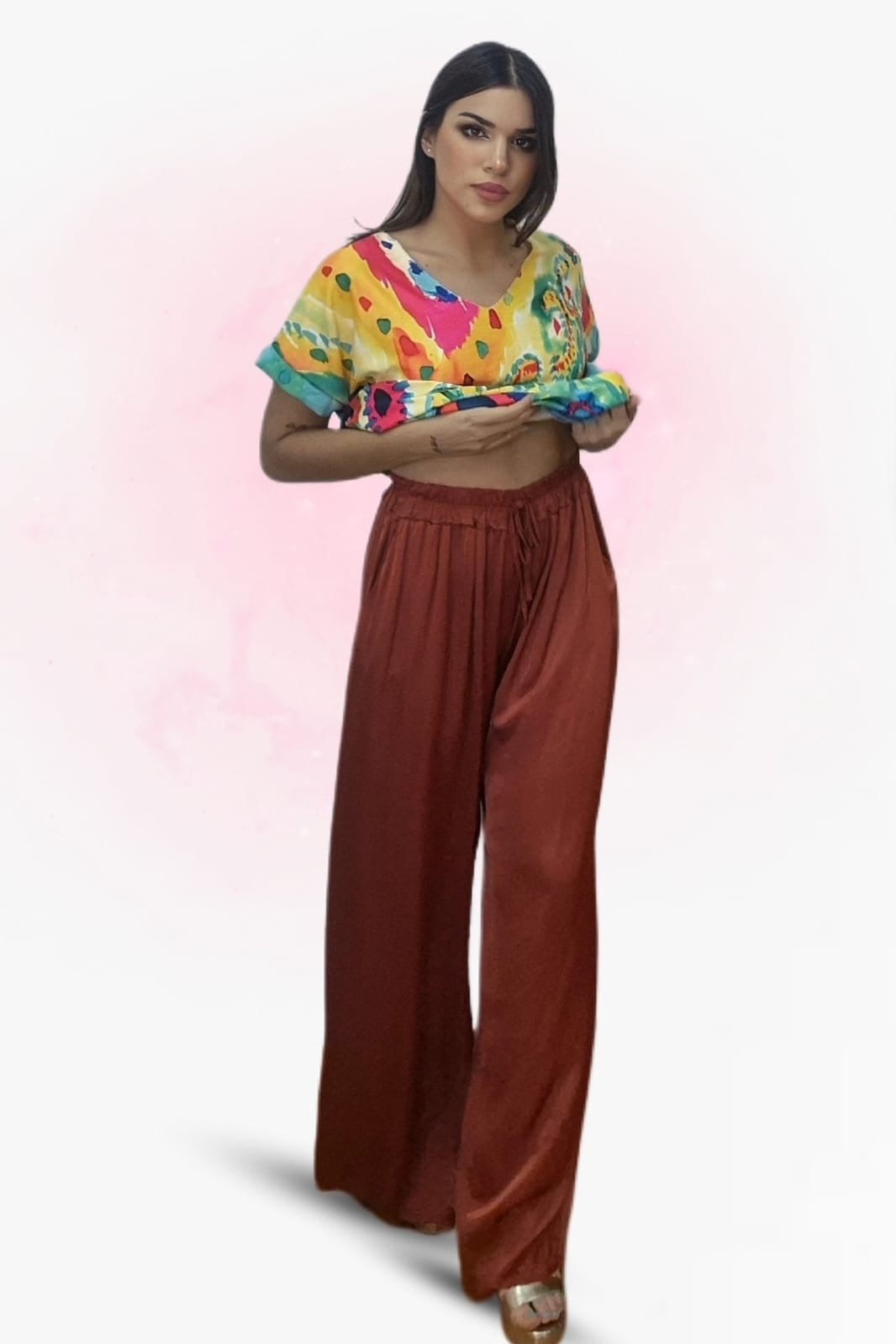Fluido, fresco y elegante. El pantalón palazzo cordón está confeccionado en 100% viscosa, lo que le aporta una caída suave y movimiento natural. Su diseño de talle medio con cintura engomada y cordón ajustable se adapta con comodidad a diferentes siluetas (talla única), convirtiéndolo en un básico versátil y muy favorecedor.