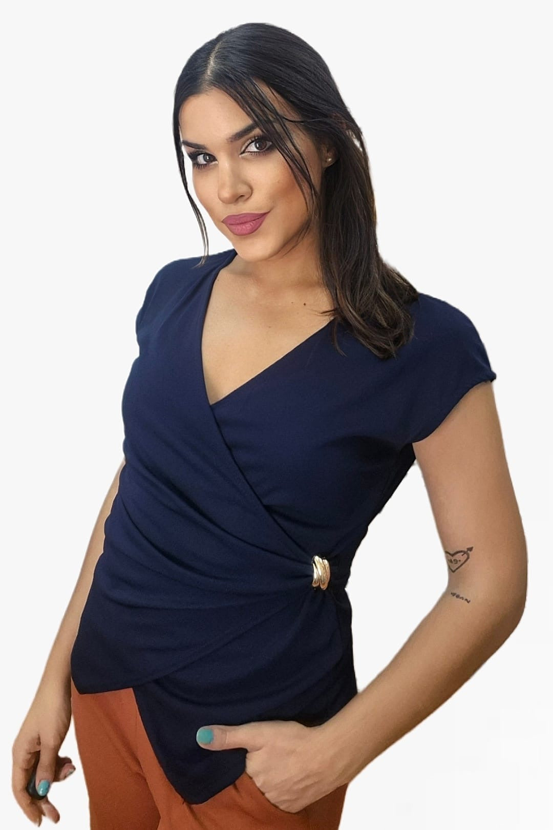 Con un diseño cruzado que realza la figura y un detalle de nudo lateral con aro que aporta un toque sofisticado, esta camiseta es el equilibrio perfecto entre comodidad y estilo. Su corte fluido y favorecedor la convierte en una prenda imprescindible para el día a día o para una ocasión especial.